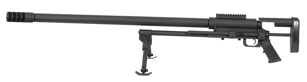 Simple and bomb proof, what more could you need? This black .50 BMG Noreen ULR, or Ultra Long Range, rifle features a single shot bolt action, 34" barrel with 1:15" twist, Noreen collapsible stock, A2 pistol grip, timney adjustable trigger, and Noreen muzzle brake with 1.25-12 thread.
