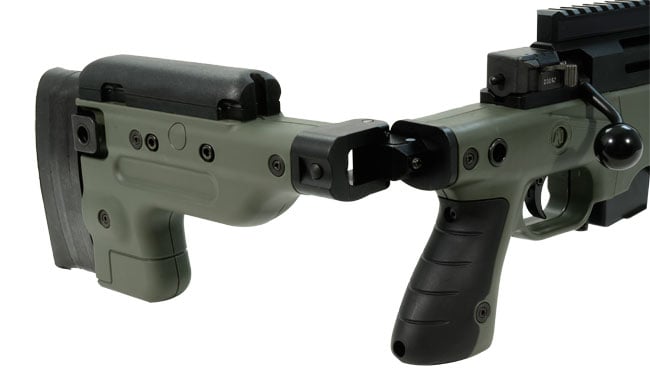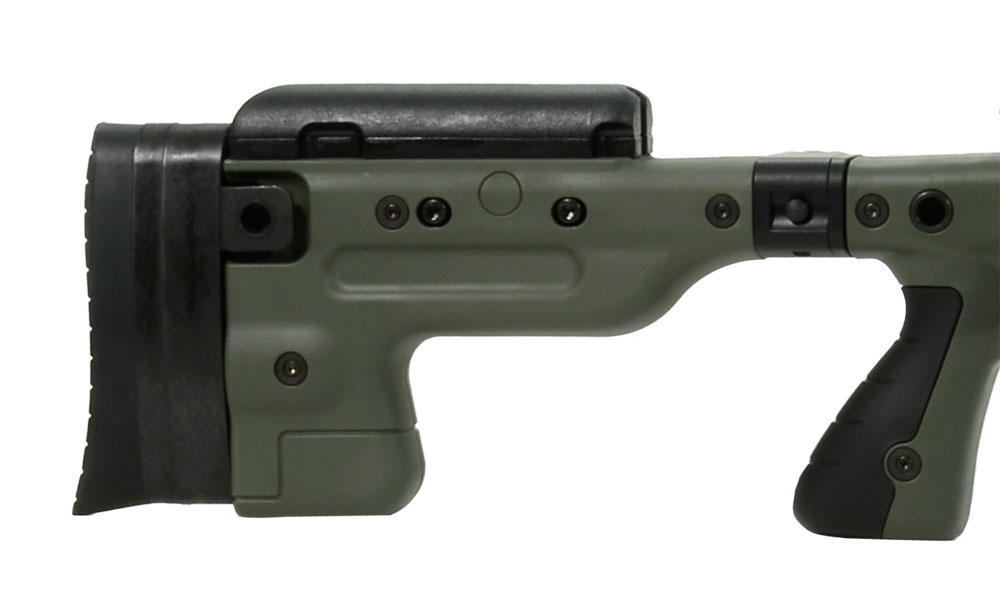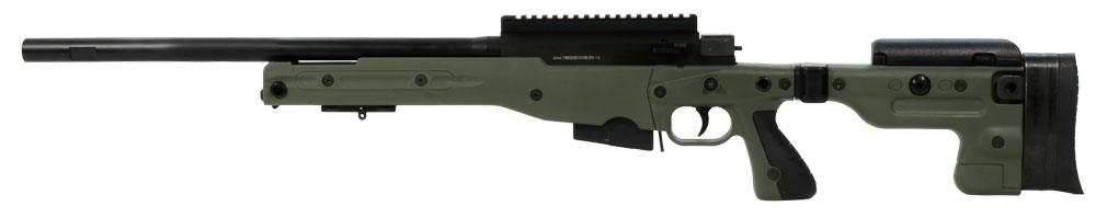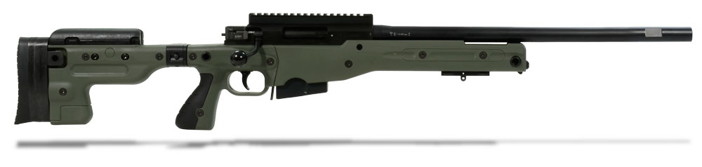 This green Accuracy International AT .308 Winchester rifle has a folding stock, 20" non-threaded barrel, adjustable cheekpiece, sling points, pistol grip, 3 position safety, two-stage trigger, flat-bottomed action, 20mm diameter close fitting bolt with six locking lugs, one-piece extractor, and corrosion resistant magazine.