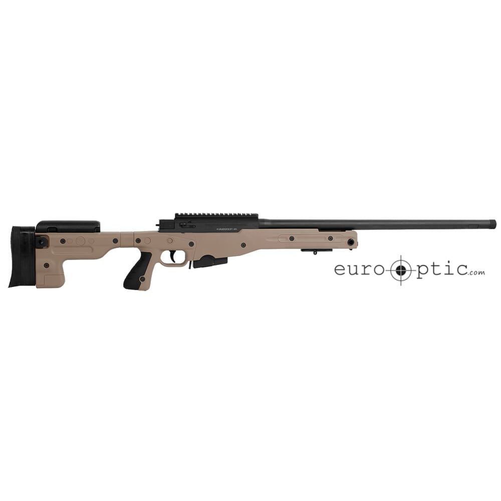 This Accuracy International AT rifle comes with a fixed pale brown stock, 24 inch barrel with a standard break and small firing pin. It is chambered around the .308 Win round and has a crisp adjustable trigger between 3.3lbs and 4.4lbs.