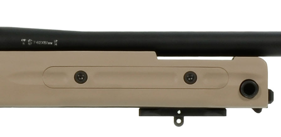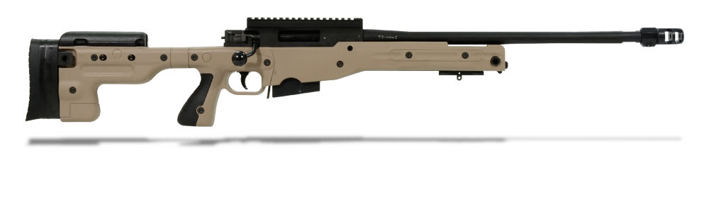 This pale brown Accuracy International AT .308 Winchester rifle has a fixed stock, 20" threaded barrel, adjustable cheekpiece, sling points, pistol grip, 3 position safety, two-stage trigger, flat-bottomed action, 20mm diameter close fitting bolt with six locking lugs, one-piece extractor, corrosion resistant magazine, and muzzle brake.