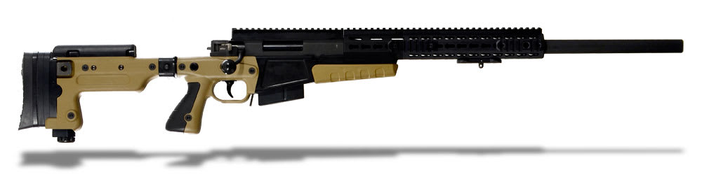 This Accuracy International AX308 with a Dark Earth finish, match grade 24" barrel, butt spike, flush cups, and target butt offers a proofed steel action, quickloc quick release barrel system, 6 lug 60° bolt with leaf spring extractor, 3 position safety, two-stage trigger, adjustable cheek piece, KeySlot™ accessory mounting system, configurable pistol grip, side cut away magazine, and detachable 10-round double stack magazines which can be loaded through the rifle ejection port.