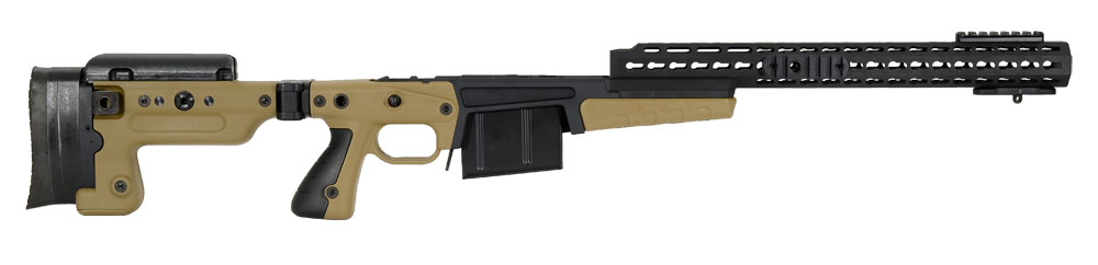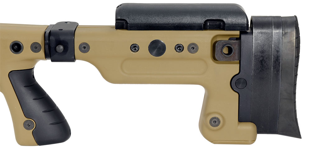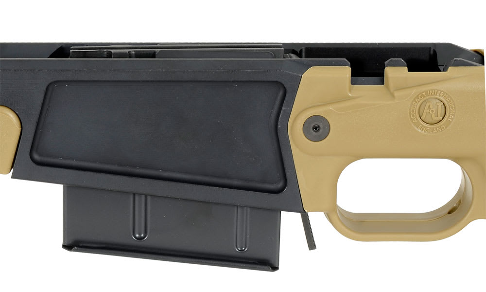 Accuracy International AX stock was built off the popular AW series with some major improvements. One of the newest features is the flat bottom design. This allows for double stacked magazines. The folding Accuracy International AX stock features adjustable cheekpieces and buttpad. The new pistol grip permits the shooter a consistent and even squeeze.