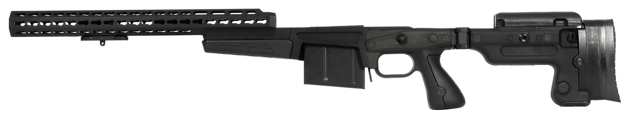 Accuracy International AX stock was built off the popular AW series with some major improvements. One of the newest features is the flat bottom design. This allows for double stacked magazines. The folding Accuracy International AX stock features adjustable cheekpieces and buttpad. The new pistol grip permits the shooter a consistent and even squeeze.