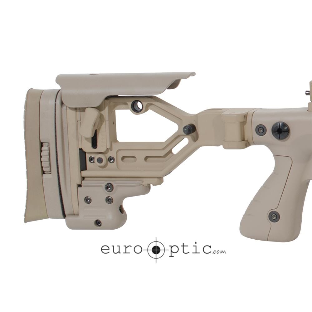 - Cheekpiece is configurable for lateral and height adjustments, and also stores a 4mm hex wrench for rifle disassembly.