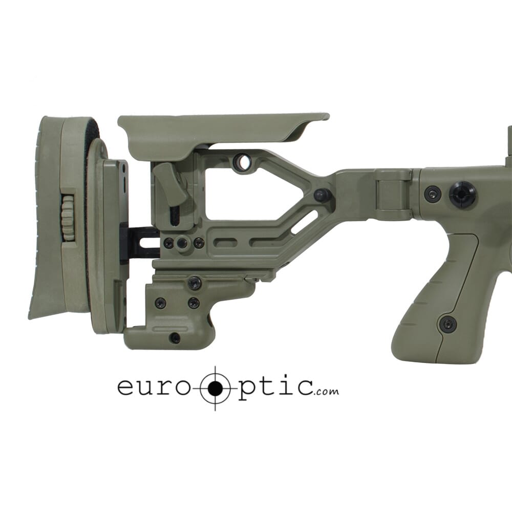 - Cheekpiece is configurable for lateral and height adjustments, and also stores a 4mm hex wrench for rifle disassembly.