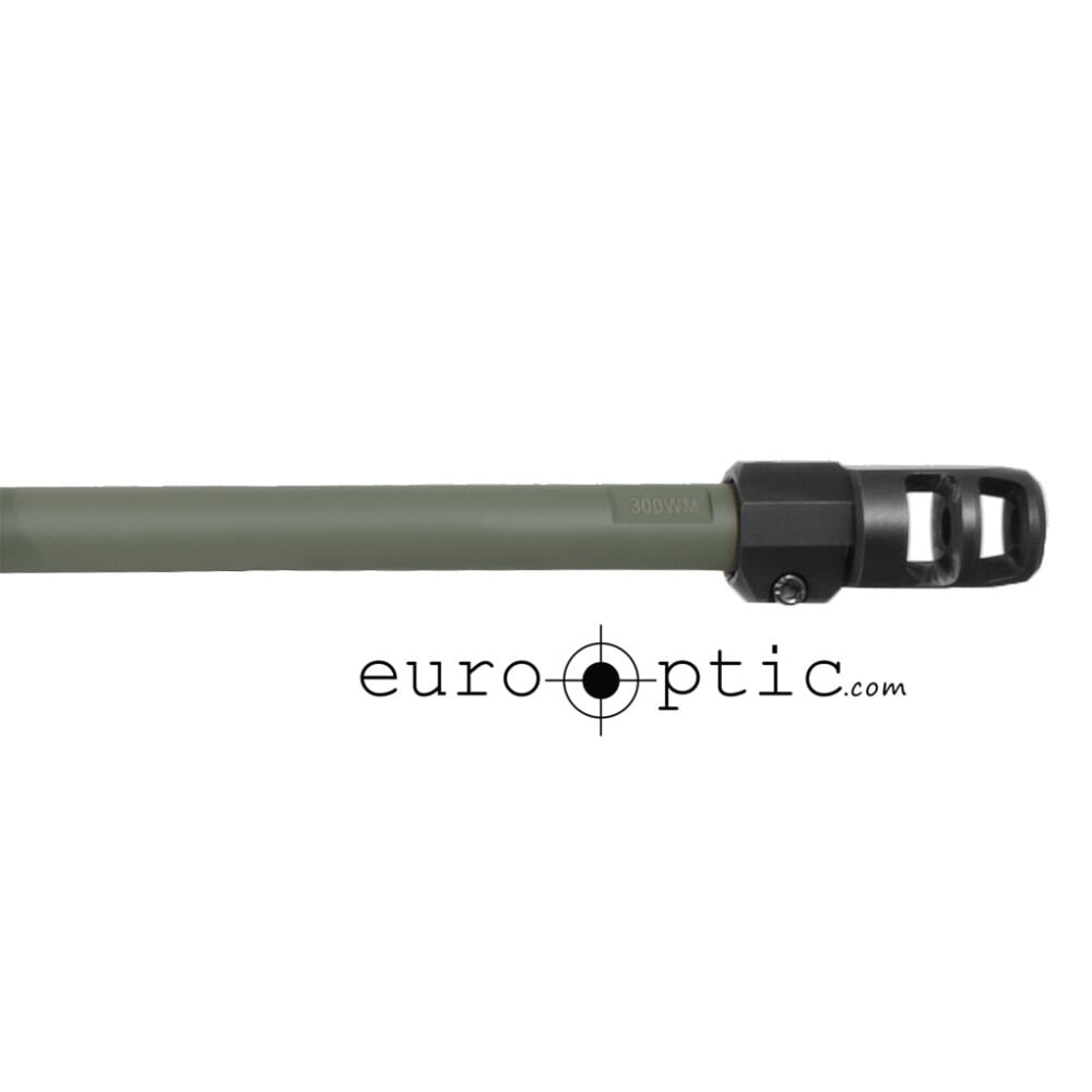 This particular Accuracy International AXMC is a .338 Norma Magnum with a 27" threaded barrel with muzzle break that features a green stock.