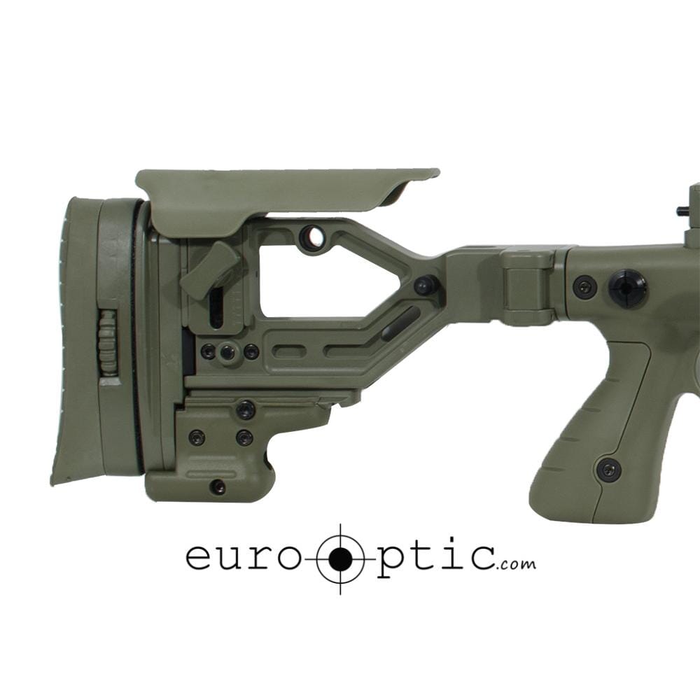- Cheekpiece is configurable for lateral and height adjustments, and also stores a 4mm hex wrench for rifle disassembly.