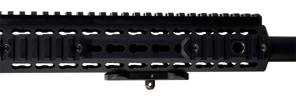 The forend rail system is a free floating tube forend 13" long featuring a keyhole slot system for quickly and securely attaching modular rail sections on to which a virtually unlimited variety of optical, ranging, support and carry options can be fitted.