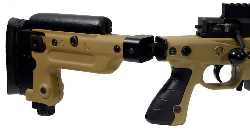 The 20mm (0.75") diameter steel close fitting bolt features an integral short throw bolt handle (60°) with large bolt knob which lies close to the stockside just above the trigger to minimise movement of the user’s hand. The bolt can be field stripped without tools for cleaning. A new strengthened design ensures safety in the most extreme environments. It is permanently bonded and bolted to the stiff aluminium chassis to eliminate movement, ensuring that zero will be maintained.