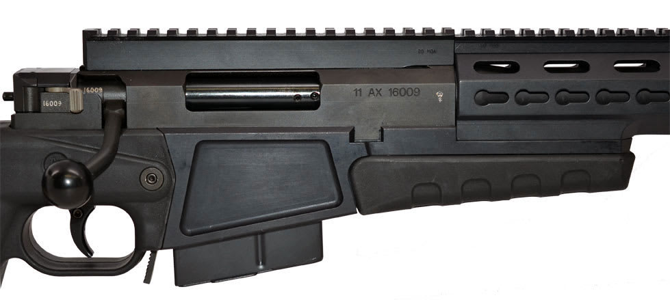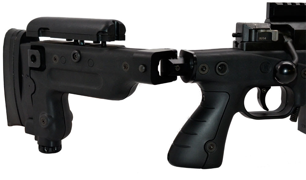 This Accuracy International AX338 black rifle with a match grade free floating 27" Barrel, brake, butt spike, QB, and QC features a butt pad, adjustable cheekpiece, pistol grip, folding chassis, sling points, bonded action, 3.3-4.4lb trigger pull, three-position safety, larger modular bolt, picatinny rail, forend rail system, and a 10-round double row steel magazine.