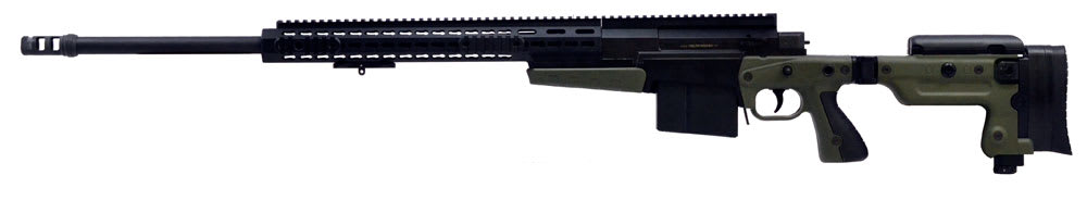 This Accuracy International AX338 green rifle with a match grade free floating 27" barrel, brake, and butt spike features a butt pad, adjustable cheekpiece, pistol grip, folding chassis, sling points, bonded action, 3.3-4.4lb trigger pull, three-position safety, larger modular bolt, picatinny rail, forend rail system, and a 10-round double row steel magazine.