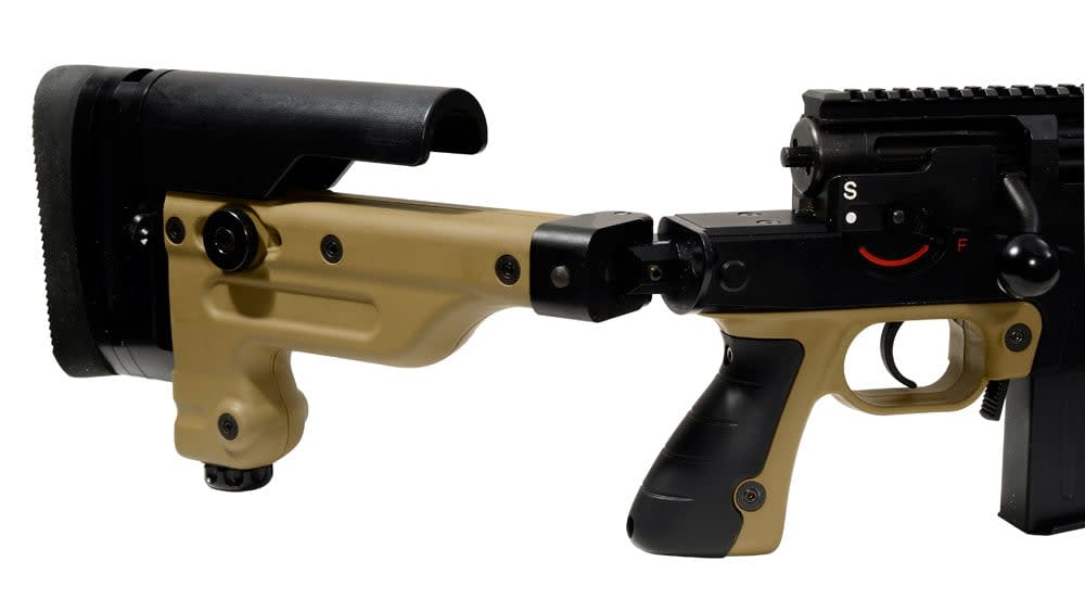 The AX50 barrel is screwed into the action with a large, 39mm diameter thread, guaranteeing consistent cold shot performance from the rigidly mounted 27" match grade free floating barrel . The double chamber muzzle brake, screwed on and tension clamped, effectively reduces recoil, muzzle flash and dust eruption. A barrel can be changed in less than ten minutes using the barrel change kit. Please view the Accuracy International AX50 Brochure to find our more information about this very special rifle.