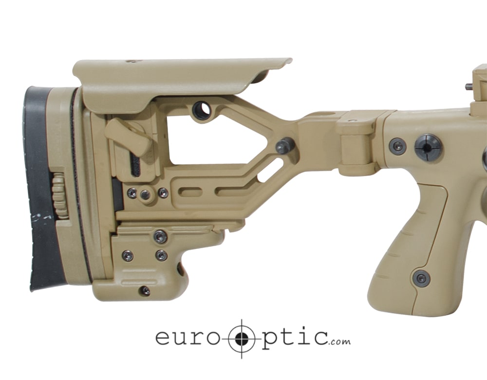 - Cheekpiece is configurable for lateral and height adjustments, and also stores a 4mm hex wrench for rifle disassembly.