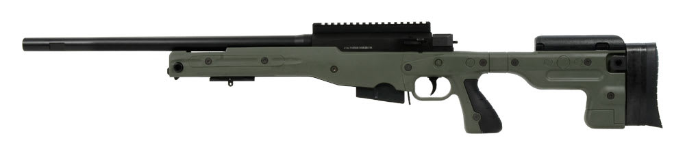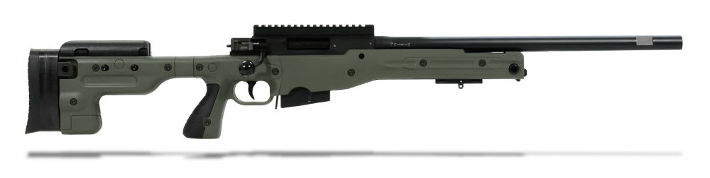 This green Accuracy International AT .308 Winchester rifle has a fixed stock, 20" non-threaded barrel, adjustable cheekpiece, sling points, pistol grip, 3 position safety, two-stage trigger, flat-bottomed action, 20mm diameter close fitting bolt with six locking lugs, one-piece extractor, and corrosion resistant magazine.