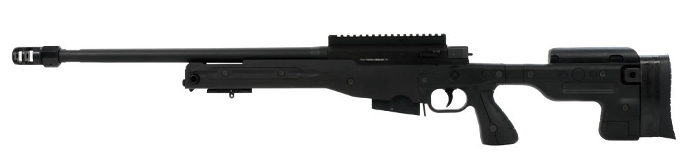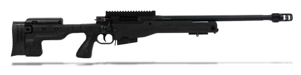 This black Accuracy International AT .308 Winchester rifle has a fixed stock, 20" threaded barrel, adjustable cheekpiece, sling points, pistol grip, 3 position safety, two-stage trigger, flat-bottomed action, 20mm diameter close fitting bolt with six locking lugs, one-piece extractor, corrosion resistant magazine, and muzzle brake.