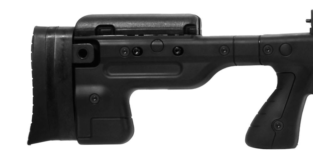 This black Accuracy International AT .308 Winchester rifle has a fixed stock, 24" non-threaded barrel, adjustable cheekpiece, sling points, pistol grip, 3 position safety, two-stage trigger, flat-bottomed action, 20mm diameter close fitting bolt with six locking lugs, one-piece extractor, and corrosion resistant magazine.