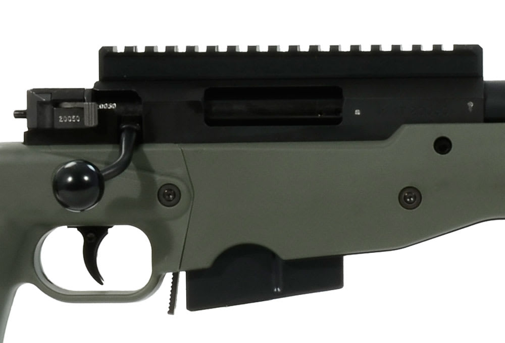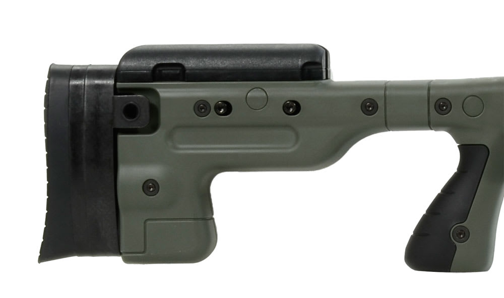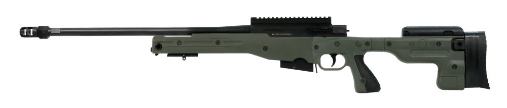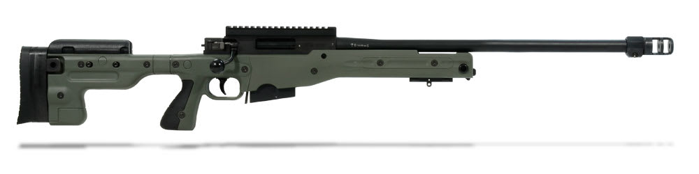 This green Accuracy International AT .308 Winchester rifle has a fixed stock, 24" threaded barrel, adjustable cheekpiece, sling points, pistol grip, 3 position safety, two-stage trigger, flat-bottomed action, 20mm diameter close fitting bolt with six locking lugs, one-piece extractor, corrosion resistant magazine, and muzzle brake.