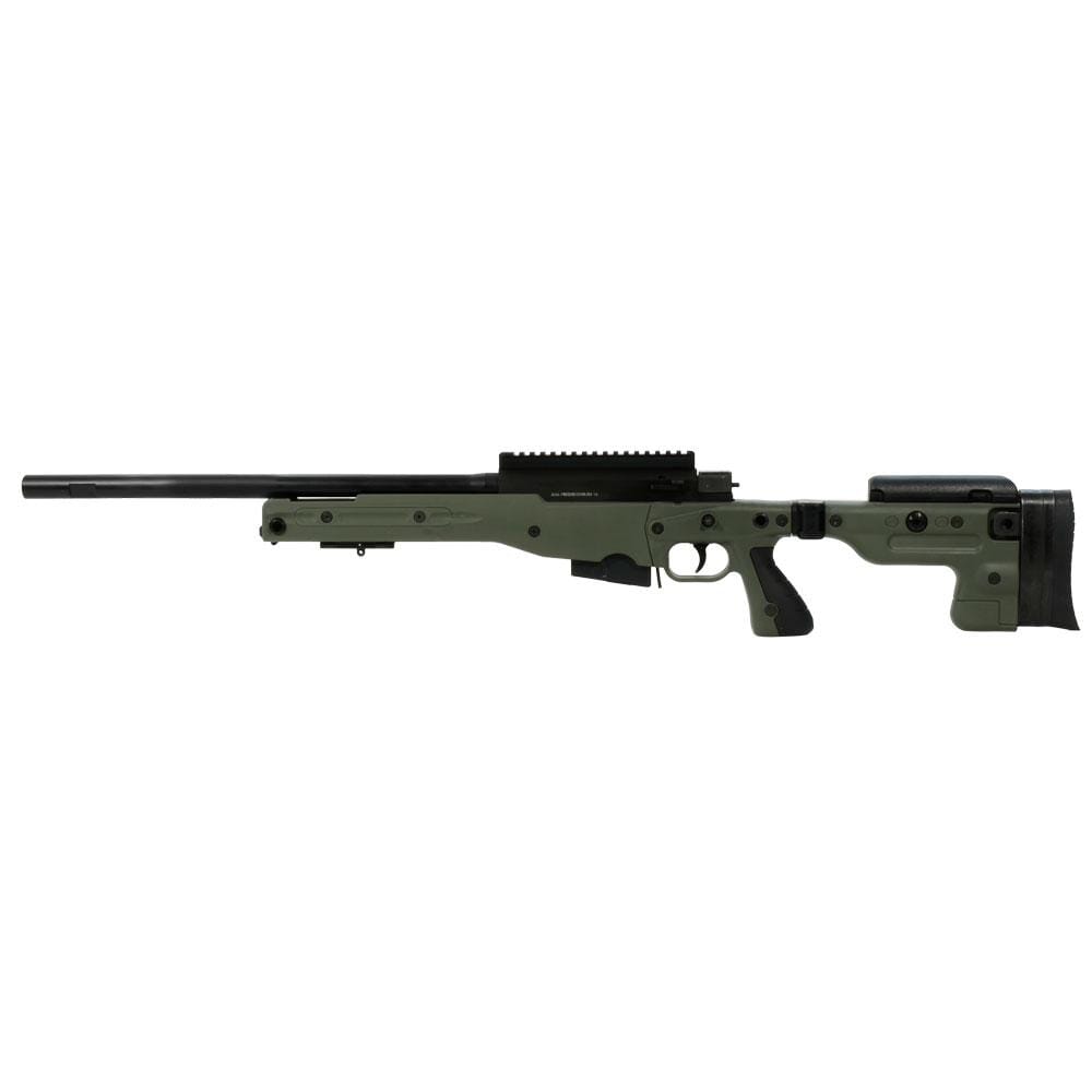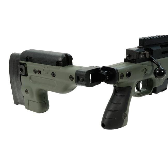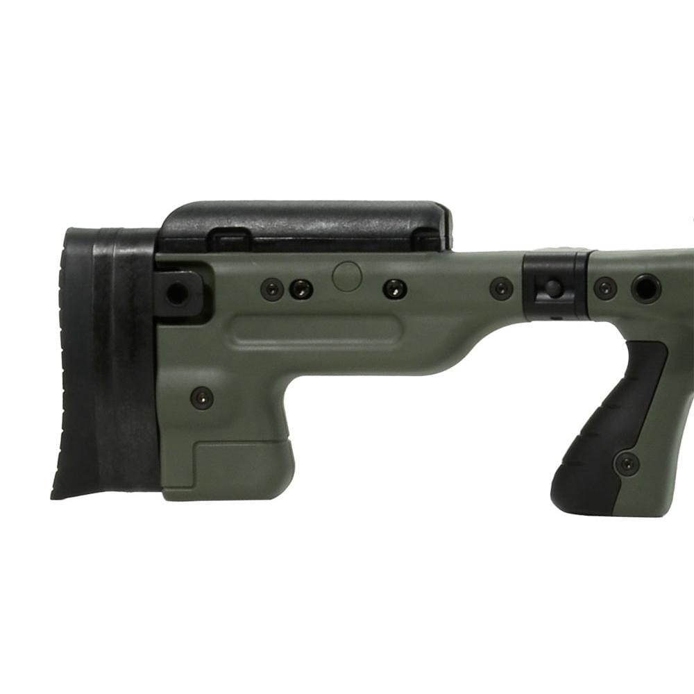 This green Accuracy International AT .308 Winchester rifle has a folding stock, 20" non-threaded barrel, adjustable cheekpiece, sling points, pistol grip, 3 position safety, two-stage trigger, flat-bottomed action, 20mm diameter close fitting bolt with six locking lugs, one-piece extractor, and corrosion resistant magazine.