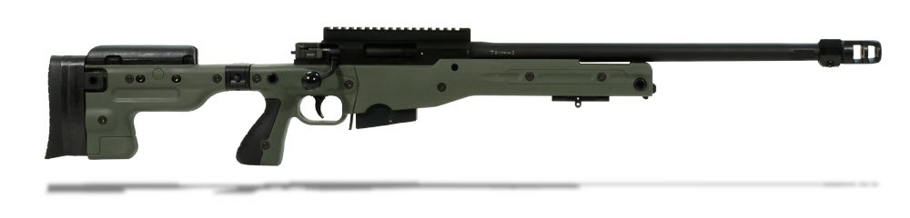 This green Accuracy International AT .308 Winchester rifle has a folding stock, 20" threaded barrel, adjustable cheekpiece, sling points, pistol grip, 3 position safety, two-stage trigger, flat-bottomed action, 20mm diameter close fitting bolt with six locking lugs, one-piece extractor, corrosion resistant magazine, and muzzle brake.