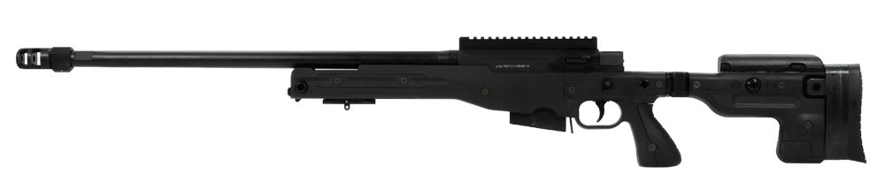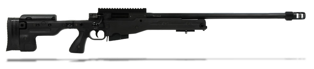 This black Accuracy International AT .308 Winchester rifle has a folding stock, 26" threaded barrel, adjustable cheekpiece, sling points, pistol grip, 3 position safety, two-stage trigger, flat-bottomed action, 20mm diameter close fitting bolt with six locking lugs, one-piece extractor, corrosion resistant magazine, and muzzle brake.