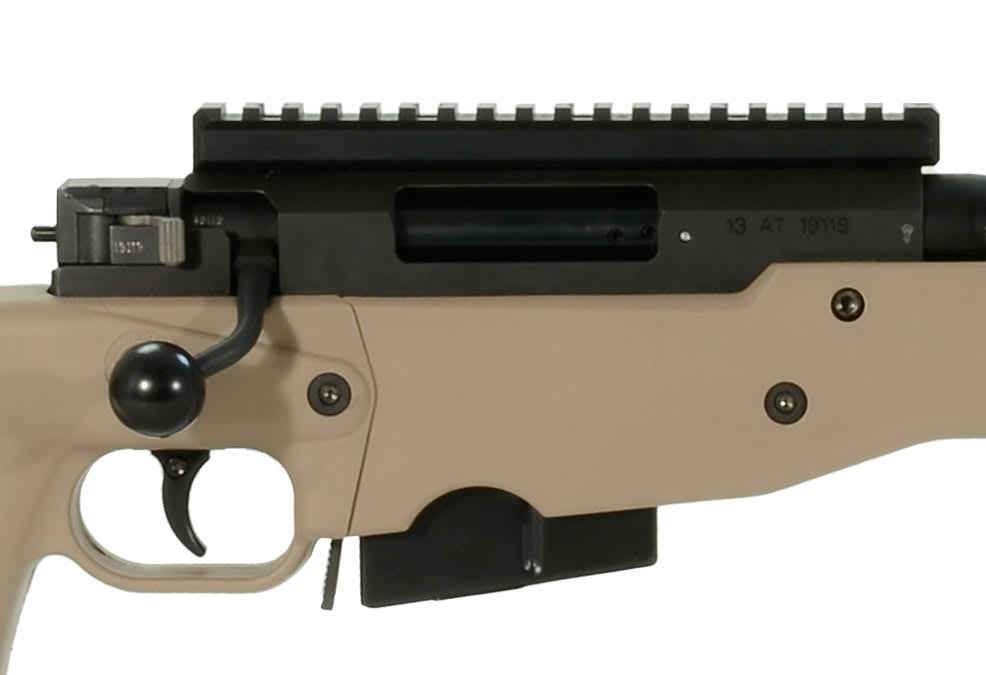 This pale brown Accuracy International AT .308 Winchester rifle has a folding stock, 26" threaded barrel, adjustable cheekpiece, sling points, pistol grip, 3 position safety, two-stage trigger, flat-bottomed action, 20mm diameter close fitting bolt with six locking lugs, one-piece extractor, corrosion resistant magazine, and muzzle brake.