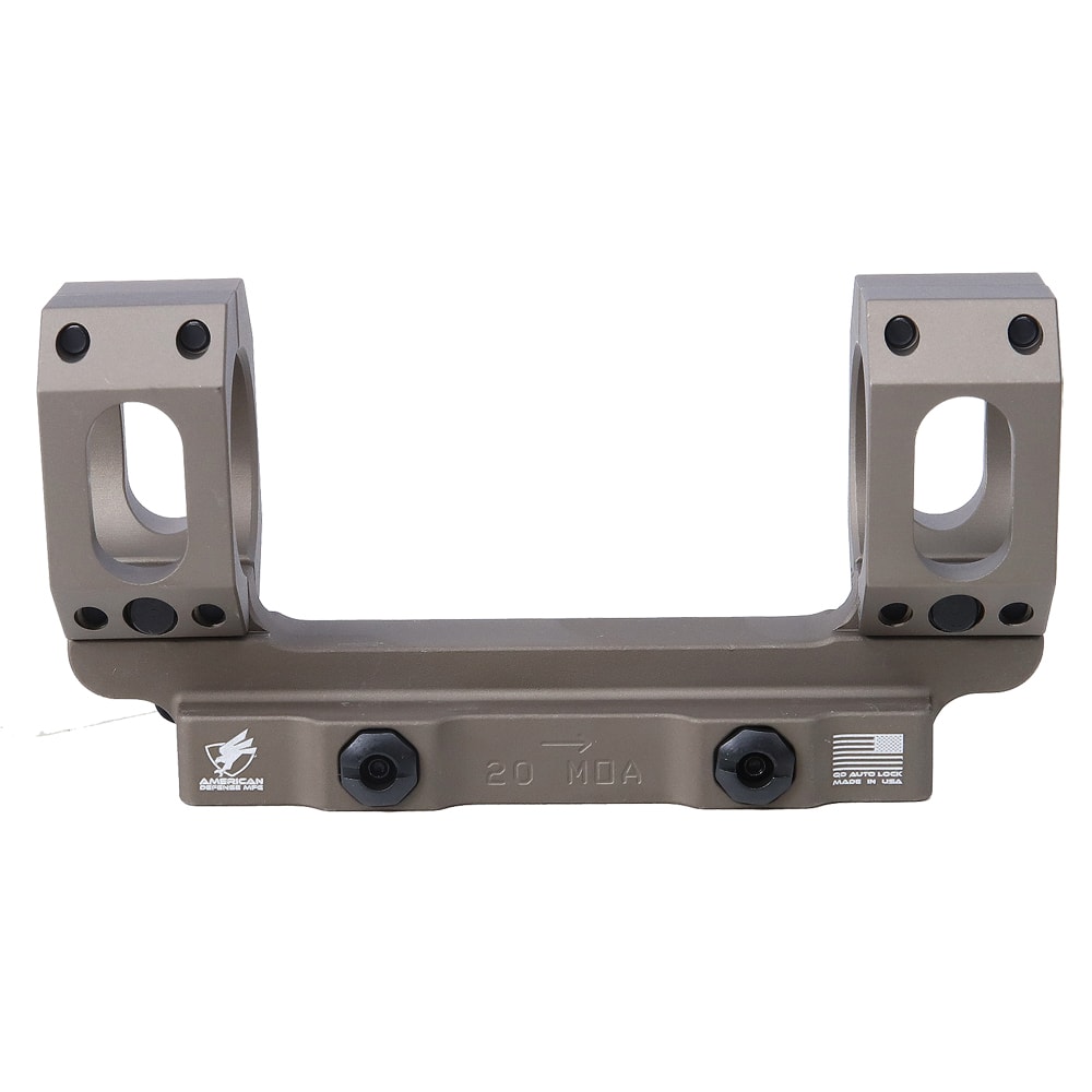 The American Defense AD-RECON-SW 20 MOA Scope Mount is designed for long-range shooting, offering a 20 MOA cant for extended elevation adjustments. Ideal for flattop AR-15 or bolt-action rifles, this mount is precision machined from 6061 T6 aluminum and finished in hard coat T3 Mil-Spec anodize for durability. The patented QD Auto Lock™ Lever system ensures secure attachment and detachment without proprietary tools, accommodating both in-spec and out-of-spec rail systems. The 30mm rings provide a stable and durable mounting solution for high-power optics.