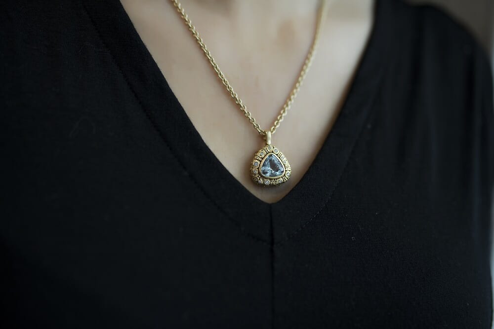 The center stone is a triangular, 11.7x11.7mm, 4.47ct aquamarine. Large and with a unique cut, this stone is sure to attract attention. Surrounding the center aquamarine stone are 10 diamonds of different shapes, weighing in at 0.18ct. These unique diamonds are placed around the body of the pendant in baroque patterns, emphasizing the shine and clarity of the center stone.