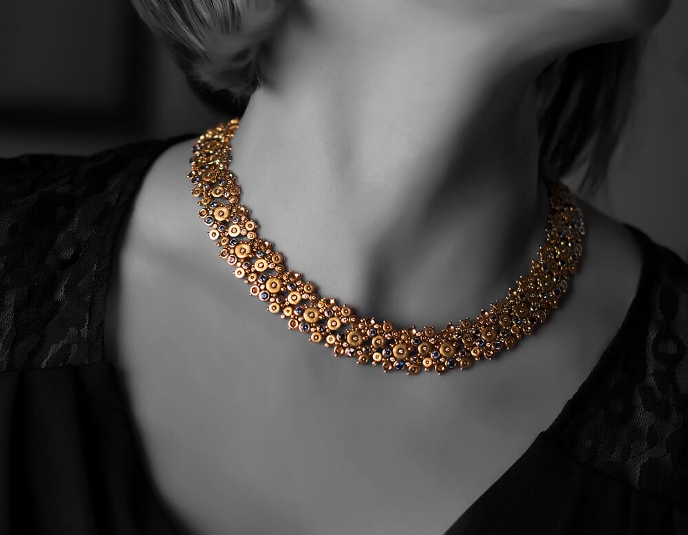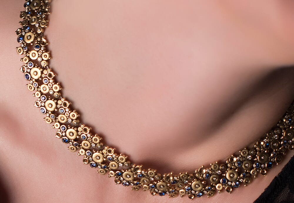 This necklace must truly be seen to believed. Incorporating 146 diamonds, 94 blue sapphires, and an 18k gold "lace" design that’s staggeringly detailed, this piece by Alex Sepkus is truly unmistakable – and is a great way to make a fashion statement.