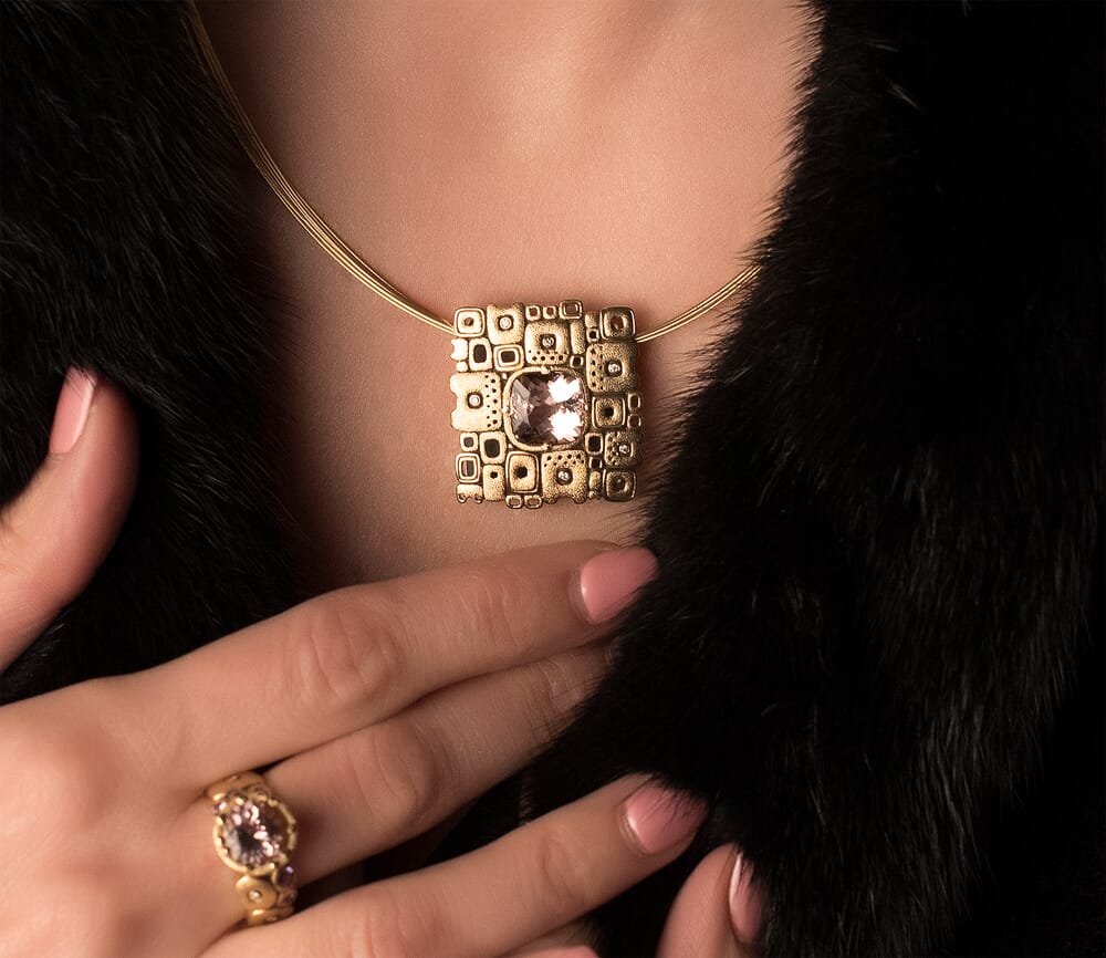 The handcrafted design of this pendant is what truly sets it apart. No two of these necklaces are quite alike, with each individual element being sculpted by a master jeweler. The combined effect of the Morganite center stone, gorgeous 18k gold, and exquisite diamonds is truly unparalleled.