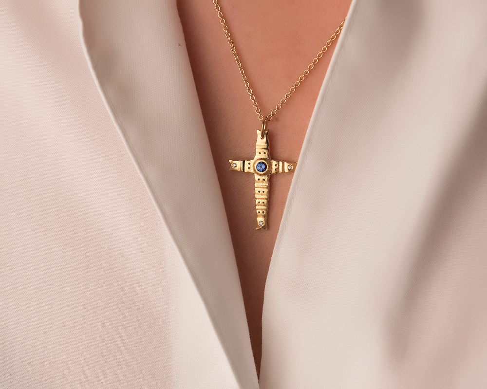 Resting at the center of this cross is a round-cut blue sapphire that weighs in at 0.15ct. Selected for clarity, purity, and color, the brilliant blue of this sapphire is sure to remind you of the calm deepness of the ocean, or the subdued purity of a dusky sky.