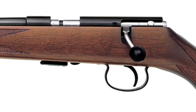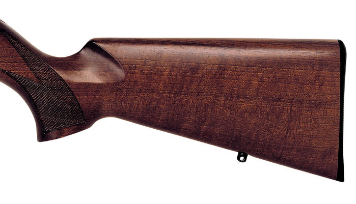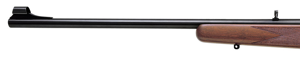 This left-hand Anschutz 1416 D 22LR Classic rifle features a single stage trigger, receiver that's drilled and tapped for scope mounts, a bolt action with a cam cocking system, claw extractor, lateral sliding safety, folding leaf sight, pearl front sight, black butt stock, studs for sling swivel, and a classic straight hunting stock with checkering at pistol grip and fore-end.