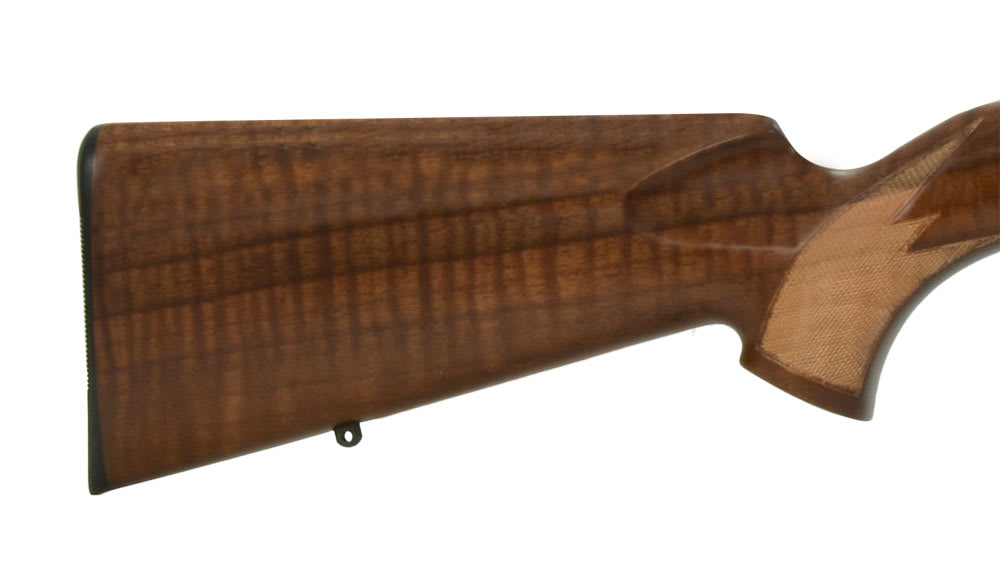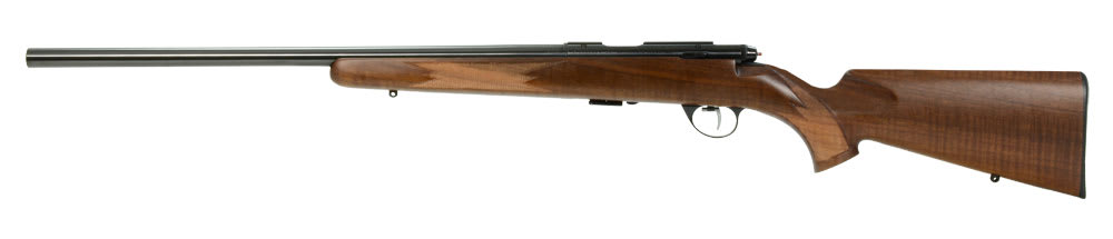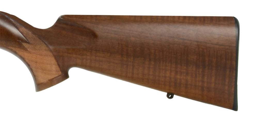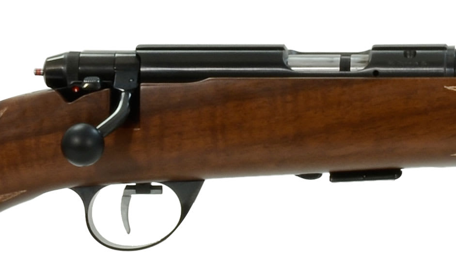 This Anschutz 1710 D HB .22LR rifle features a match trigger, heavy barrel, cam cocking bolt, claw extractor, wide grooved receiver rail, and an independent lateral bolt stop.