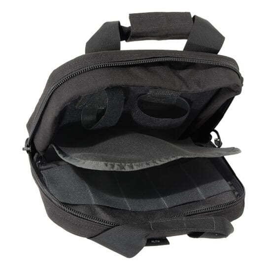 This USA-made, compact, black Armageddon Perfect Pistol Case is fully functionally with its five elastic magazine slits, velcro loop-lined inner panel, milspec 1000 denier solution-dyed cordura nylon handles, and high-density closed-cell foam padding.
