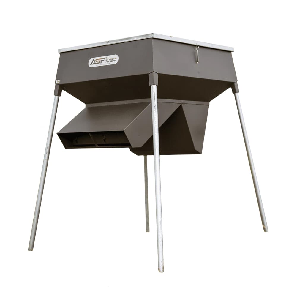 The ASF 800lb Combo Protein/Cotton Seed Feeder is a versatile feeding solution that combines free-choice protein pellets and cottonseed in one unit. This feeder features a 16-gauge hopper with pipe legs, a galvanized lid with lid springs and hooks, and a sight glass for monitoring feed levels. The split hopper design allows for 450lbs of protein and 350lbs of cottonseed, providing optimal nutrition for deer. Its durable construction ensures long-lasting performance in various environments