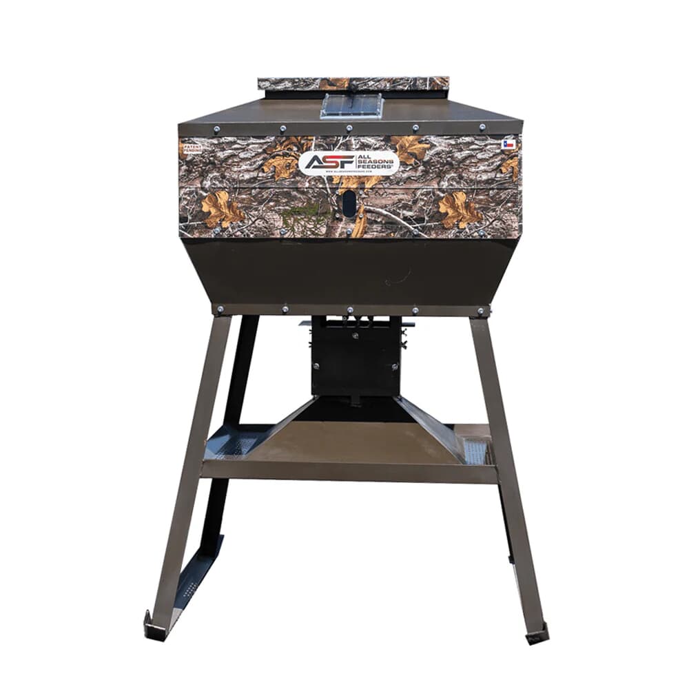 The ASF CornPro 600lb Camo Broadcast Feeder is a versatile feeding solution that combines the convenience of ground-level filling with the durability of heavy-duty construction. This feeder features a patent-pending dual-purpose dispersant housing that allows you to time feed in two ways: broadcasting corn or trough feeding protein. Equipped with the Eliminator spinner, THE-TIMER, a 12v solar panel, and a 12v battery, this feeder ensures precise feed distribution and reliable operation. The Realtree® camo design helps it blend into natural surroundings, making it less noticeable to wildlife