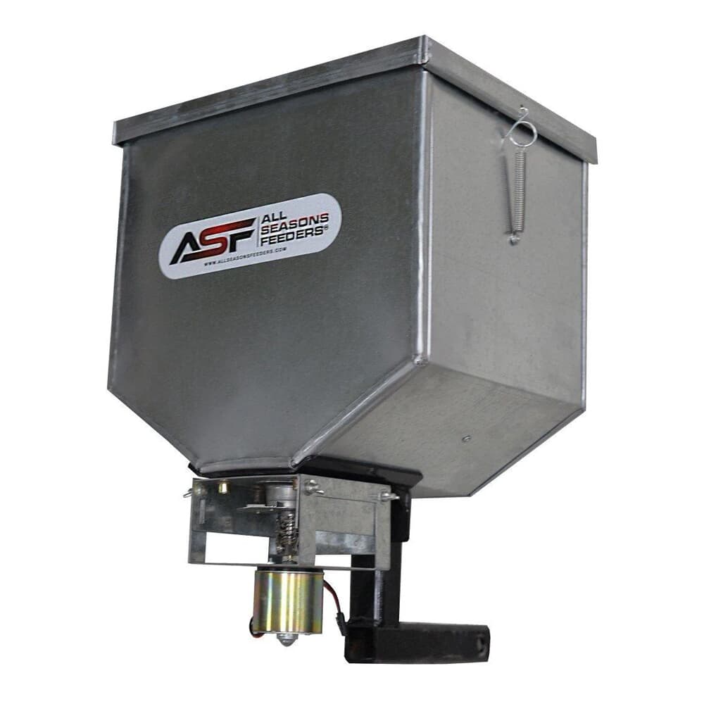 The ASF Galv 100lb Road Feeder 765665352344 is a robust and efficient feeder designed for UTV applications. Made from galvanized metal, this road feeder is rustproof and built to last. It features a spinner mechanism that not only rotates but also moves up and down to create a closed seal when the motor is off. The unit operates using a push-button switch that plugs into your vehicle's lighter receptacle, ensuring easy and efficient operation. This feeder is ideal for distributing corn, seed, or fertilizer, making it a versatile choice for various outdoor activities