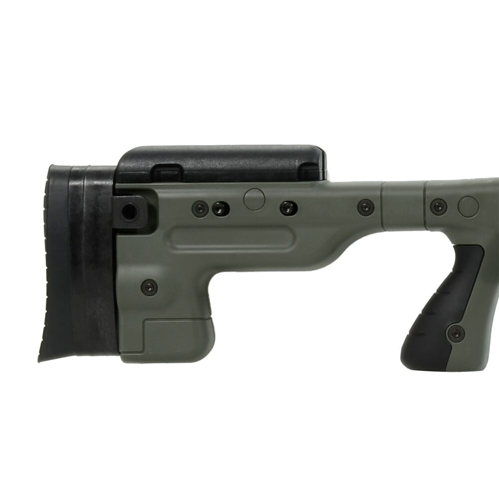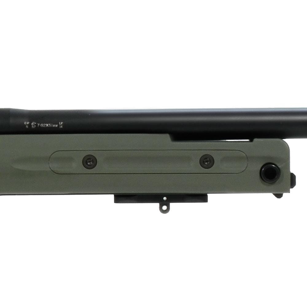 - 20mm diameter close-fitting bolt with 6 locking lugs and AI one-piece extractor. To minimize hand movement, the short 60° throw bolt is positioned close to the stock, and just above the trigger.