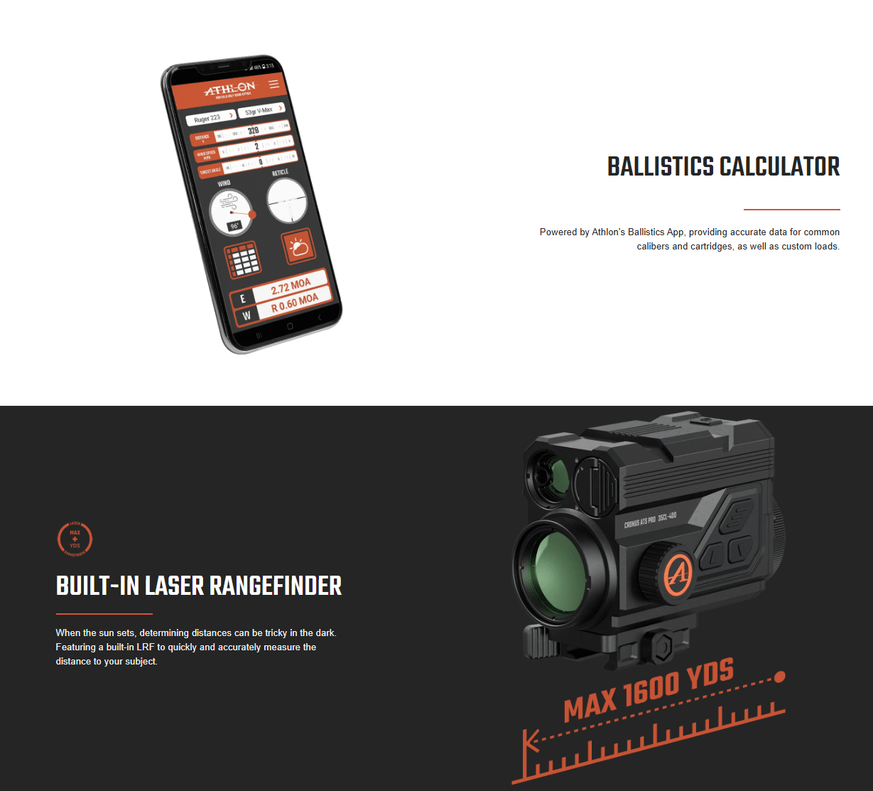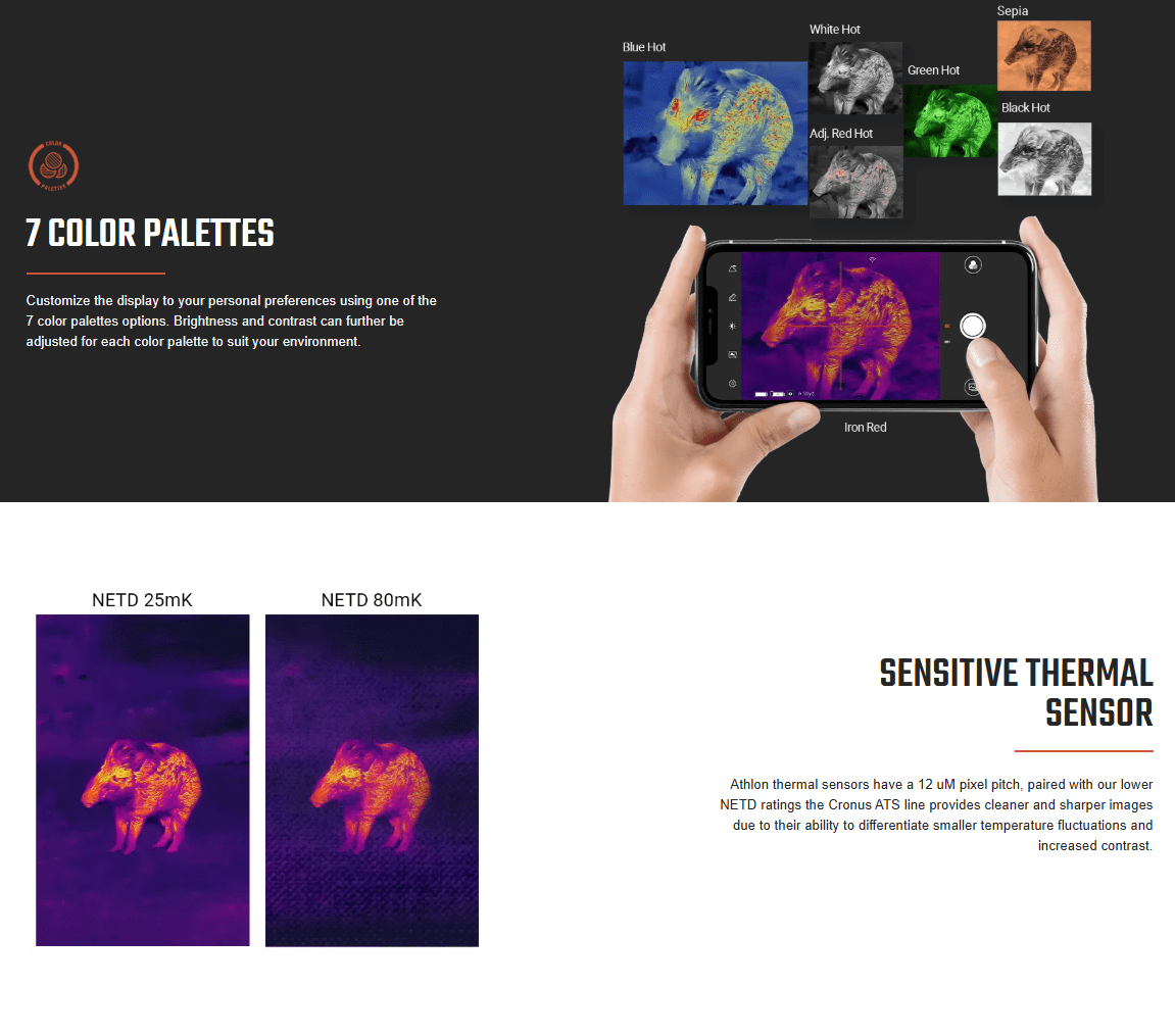 Athlon’s Cronus ATS PRO Series allows you to convert a traditional daytime riflescope into a powerful thermal optic. These high-performance thermals are available in multiple sensor resolutions and magnifications, all of which boast an NETD sensitivity rating of <25mK and a detection range of 1950 yards, thanks to a cutting edge 12µm thermal sensor. In terms of mounting, the Cronus ATS PRO can be positioned in front of the daytime scope via Picatinny interface or attached directly to the daytime scope’s objective lens with an optional adapter. The Cronus ATS PRO also features seven user-selectable color palettes and a high-resolution OLED display. Additionally, the Cronus ATS PRO is photo- and video-capable, and it offers shot-activated recording that records video when recoil is detected.