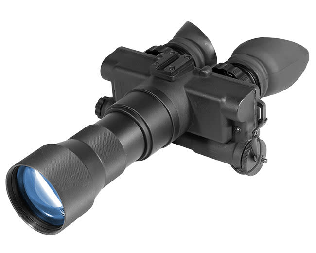 The medium-range ATN NVB3X-CGT night vision Bi-ocular features a detachable long range infrared illuminator, adjustable interpupillary distance, built-in flood infrared illuminator, automatic brightness control, 3x magnification, and water/fog resistance.