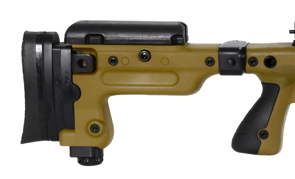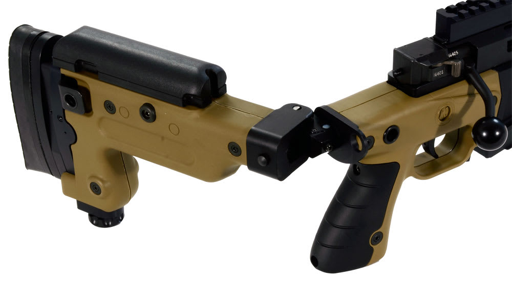 The 20mm (0.75") diameter steel close fitting bolt features an integral short throw bolt handle (60°) with large bolt knob which lies close to the stockside just above the trigger to minimise movement of the user’s hand. The bolt can be field stripped without tools for cleaning. A new strengthened design ensures safety in the most extreme environments. It is permanently bonded and bolted to the stiff aluminium chassis to eliminate movement, ensuring that zero will be maintained.