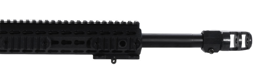 The forend rail system is a free floating tube forend 16" long featuring a keyhole slot system for quickly and securely attaching modular rail sections on to which a virtually unlimited variety of optical, ranging, support and carry options can be fitted.