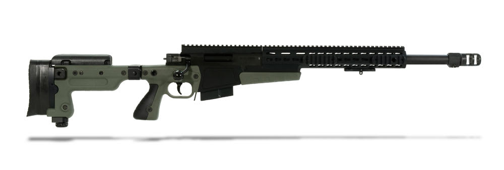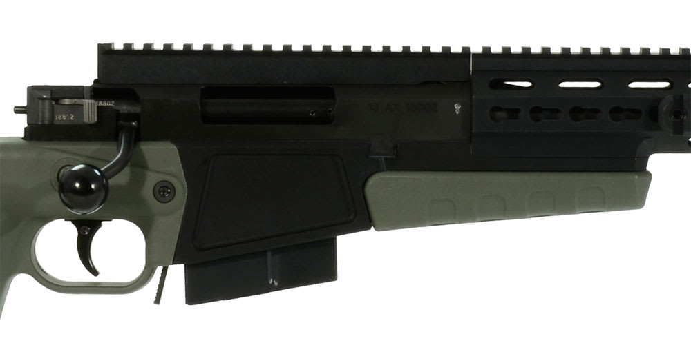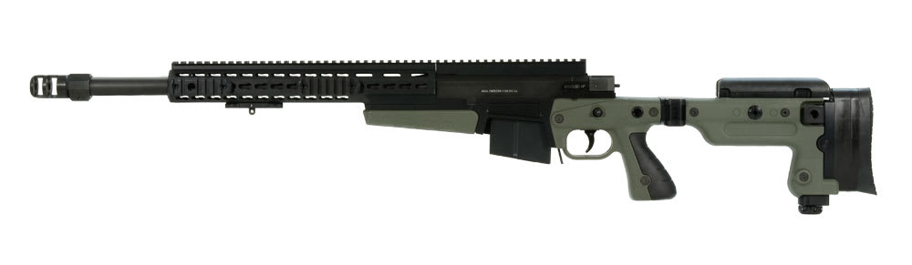 The 20 moa taper Picatinny rail is pinned and screwed to the action providing a standard interface for many optical systems. The match grade Bartlein 5R barrel is threaded deep into the action with a large diameter thread. The magazine is surface toughened, and finished with a multi-part anti-corrosive, anti-friction coating, the compact 10-round double row, military grade steel magazine combined with the revised chassis design makes loading faster and more positive without lifting the rifle.