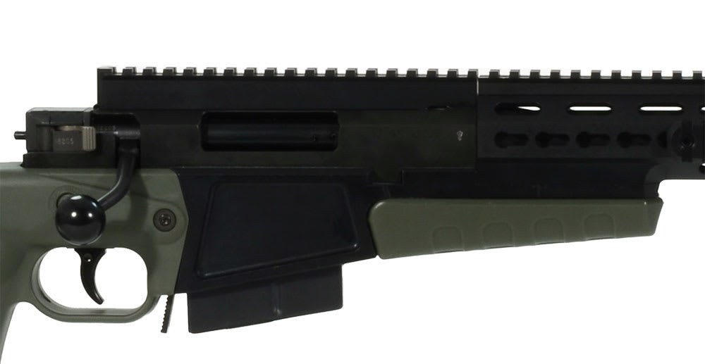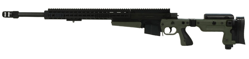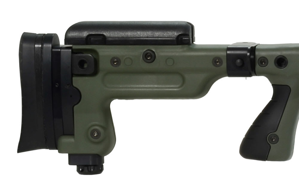 This Accuracy International AX .308 rifle has a green folding stock, 24" plain barrel, adjustable cheekpiece, adjustable buttpad with spacers, pistol grip, flush cup sling attachment points, Mil stad 1913 action rail, 16" forend tube, and a double chamber standard muzzle brake.