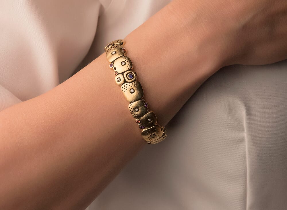 The bracelet design is equally stunning. Using unevenly shaped, quirky gold components that feature a variety of different patterns, it’s eclectic and varied – yet every element is brought together by the gorgeous jewels within the bracelet itself.