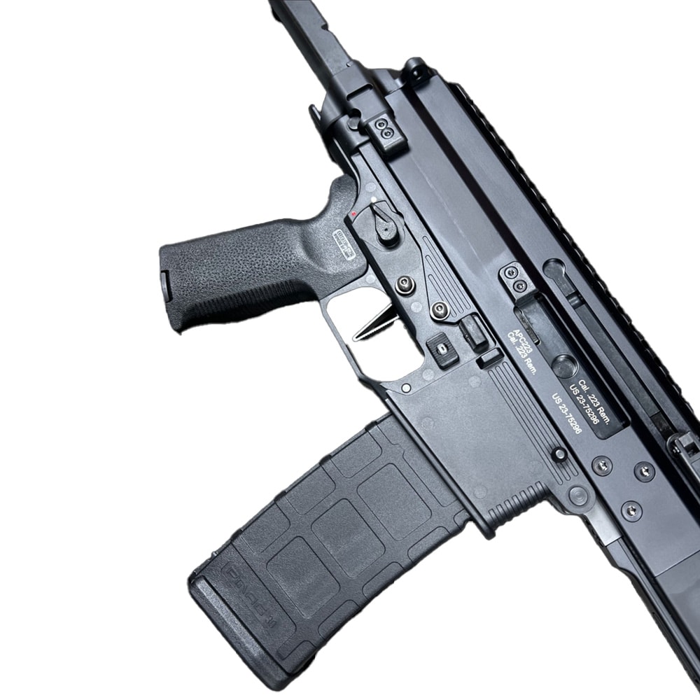 B&T’s line of APC (Advanced Police Carbine) firearms was created to meet the demands of military and law enforcement professionals around the world, and have been optimized for accuracy, reliability and ease of use. Each APC unit is exceptionally well-machined, and is manufactured with the Swiss-made precision that B&T is known for. This is particularly evident in the hydraulic shock-absorbing buffer which greatly mitigates recoil and enhances overall accuracy, as well as a cold-hammer forged barrel with a remarkably long service life. The result is a weapon that is controllable on rapid fire, accurate and comfortable to shoot. In addition, many of the APC’s controls are reminiscent of the AR-15 platform, such as the ambidextrous safety selector, the trigger assembly, and its ability to accept AR-type magazines. These similarities make for a better shooting experience for someone already acquainted with the AR-15.
