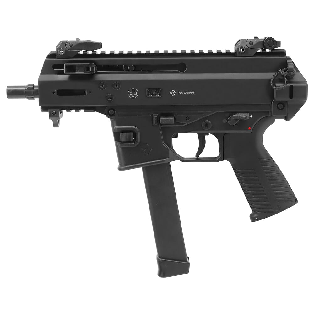 As one of the flagships of B&T, the APC9K-G PRO represents a breakthrough in customization and modularity on a pistol-caliber platform. Every component is of the highest quality, and is meticulously machined and fitted with the Swiss-made precision that B&T is known for. The APC9K-G PRO itself is equipped with several major upgrades such as enhanced lower receiver ergonomics and a side positioned bolt hold open/release. The APC9K-G PRO also sports a non-reciprocating, auto-folding charging handle to reduce the risk of snagging on loose clothing/equipment. At the heart of the APC system is the hydraulic shock-absorbing buffer system which greatly mitigates recoil and enhances overall accuracy. In terms of customization, the APC9K-G PRO features a flattop picatinny rail for optics as well as an under-barrel rail for lights/lasers. Each APC9K-G PRO unit also has a variety of B&T made accessories including brass-catchers, extended magazines, and fore-grips designed specifically for that model. In addition, many aspects of the APC9K-G PRO are reminiscent of the AR-15, such as the ambidextrous selector switch, the ergonomics, trigger assembly and accepts AR-15 style grips. These similarities make for a better shooting experience for someone already acquainted with the AR-15. This APC9 PRO-G's lower receiver has also been outfitted to accept the widely available Glock magazines, including the 33 round extended magazine.
