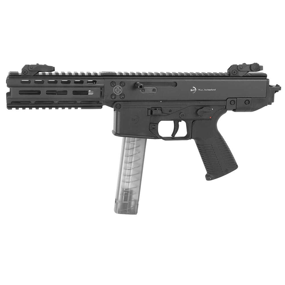 The upper receiver of the B&T GHM9 is one solid piece and features Picatinny rails at the 12 and 6 o’clock positions for mounting optics and accessories. Removable flip-up sights are included with the GHM9 allowing the pistol to be functional right out of the box. The rear of the pistol has a mounting surface for attaching a folding pistol brace or for turning the GHM9 pistol into a GHM9 short barreled rifle by attaching a stock (after the proper NFA paperwork has been filed and approved). The GHM9 from B&T is an incredible PDW mixing Swiss workmanship and reliability with features that similar firearms fail to include.