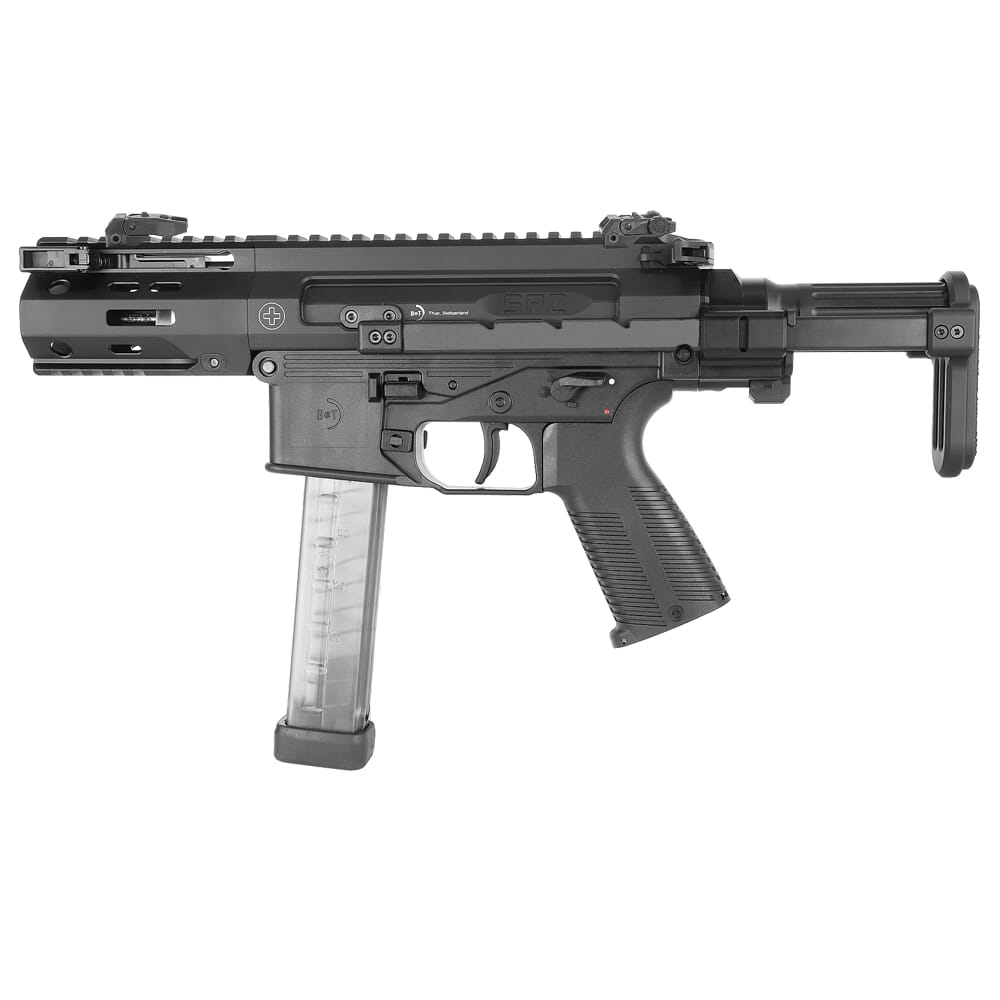 B&T breaks new ground with the SPC9-SD SBR! This hybrid AR-platform incorporates a variety of different features found on many weapons from around the world, earning nicknames such as the “Frankengun”. One of its more notable features is the B&T designed hydraulic buffer system, which greatly mitigates recoil and enhances overall accuracy. Another prominent aspect of the SPC9 is the lower receiver which takes much of its design from the B&T APC9 series, including its polymer grips, ambidextrous AR-style safety, and ambidextrous magazine release. This lower receiver utilizes the ultra-reliable polymer magazines, but can be swapped out with other B&T lowers that accept the more readily available Glock and Sig Sauer 320 magazines. Other features of the SPC9 include two different charging handle systems: a classic AR-type charging handle and a non-reciprocating, foldable charging handle mounted above the barrel. Both of these systems are fully ambidextrous and allows the operator to use whichever system they prefer. In addition, the SPC9 is outfitted with integral suppressor made by B&T, offering excellent sound and muzzle flash reduction, as well as a collapsible telescopic stock for greater control and accuracy.