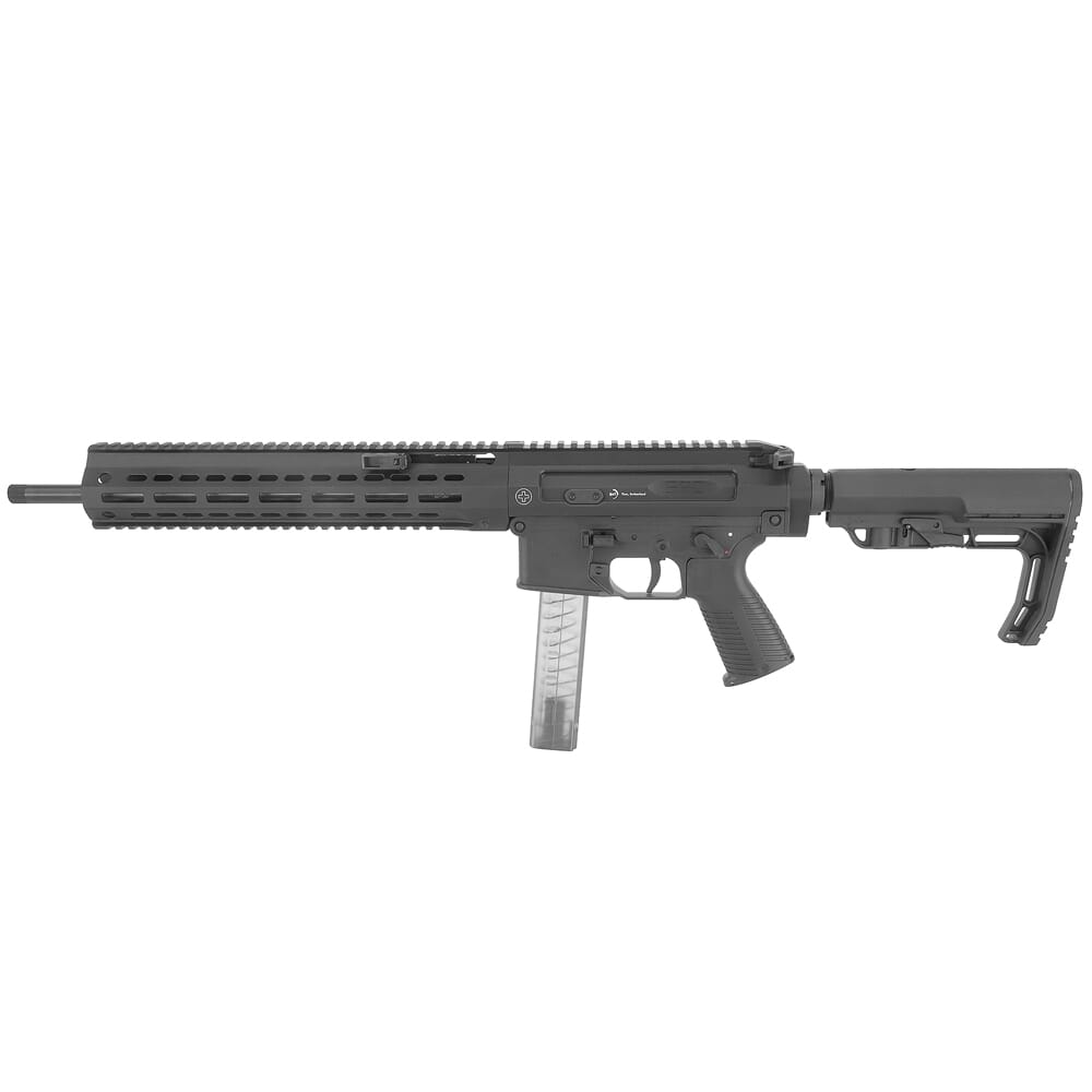 B&T breaks new ground with the SPC9 series of Personal Defense Weapons! This hybrid AR-platform incorporates a variety of different features found on many weapons from around the world, earning nicknames such as the “Frankengun”. One of its more notable features is the B&T designed hydraulic buffer system, which greatly mitigates recoil and enhances overall accuracy. Another prominent aspect of the SPC9 is the lower receiver which takes much of its design from the B&T APC9 series. This lower accepts the reliable B&T polymer magazines, but versions that accept Glock and Sig 320 magazines are available as well. In addition, the SPC9 features two different charging handle systems: a classic AR-type charging handle and a non-reciprocating, foldable charging handle mounted above the barrel. Both of these systems are fully ambidextrous and allows the operator to use whichever system they prefer.
