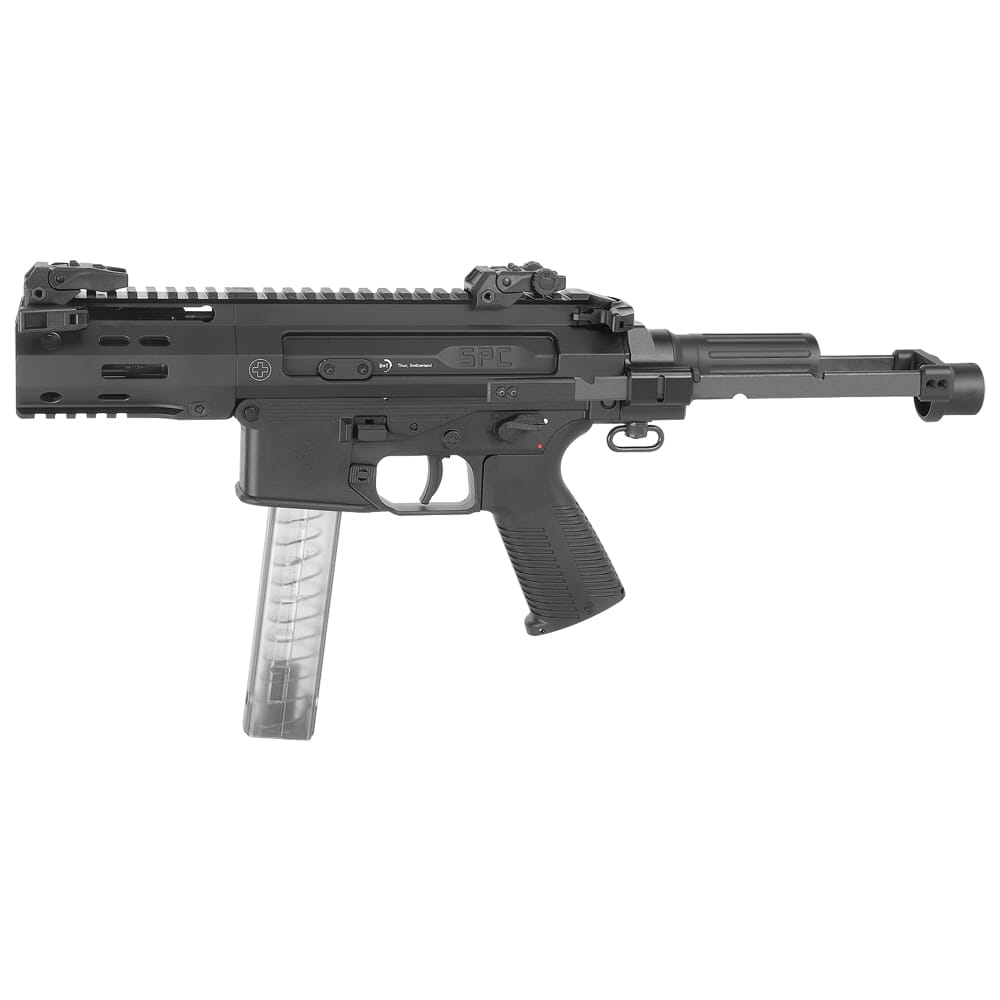 B&T breaks new ground with the SPC9! This hybrid AR-platform incorporates a variety of different features found on many weapons from around the world, earning nicknames such as the “Frankengun”. It comes equipped with an integral suppressor system which greatly mitigates sound and muzzle flash without adding any significant impact to the profile or handling of the weapon. One of its more notable features is the B&T designed hydraulic buffer system, which greatly mitigates recoil and enhances overall accuracy. Another prominent aspect of the SPC9 is the lower receiver which takes much of its design from the B&T APC9 series, including its polymer grips, ambidextrous AR-style safety, and ambidextrous magazine release.